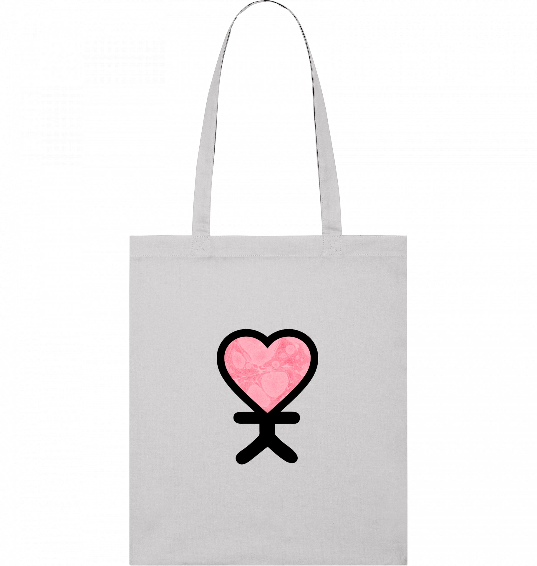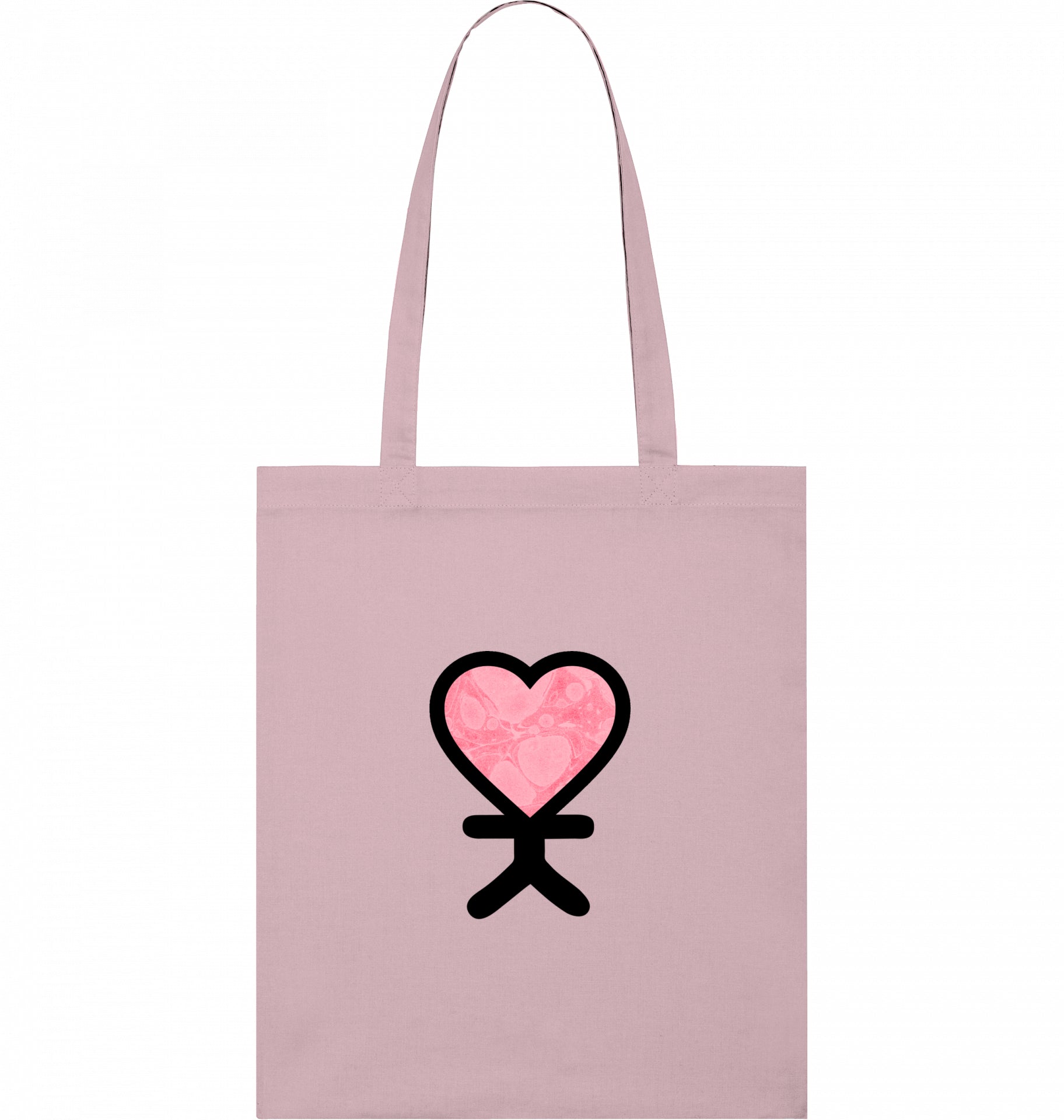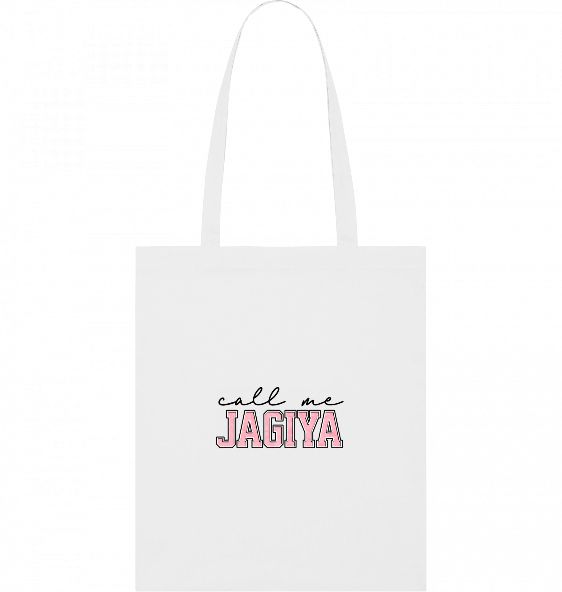 Lightweight, woven tote bag made of high-quality, combed, ring-spun organic cotton. Stylish prints: "call me JAGIYA" in pink college font on the front, and a heart symbol on the back. The top edges are folded for a sturdy, high-quality finish, and long handles with reinforced cross-stitch ensure comfortable carrying.