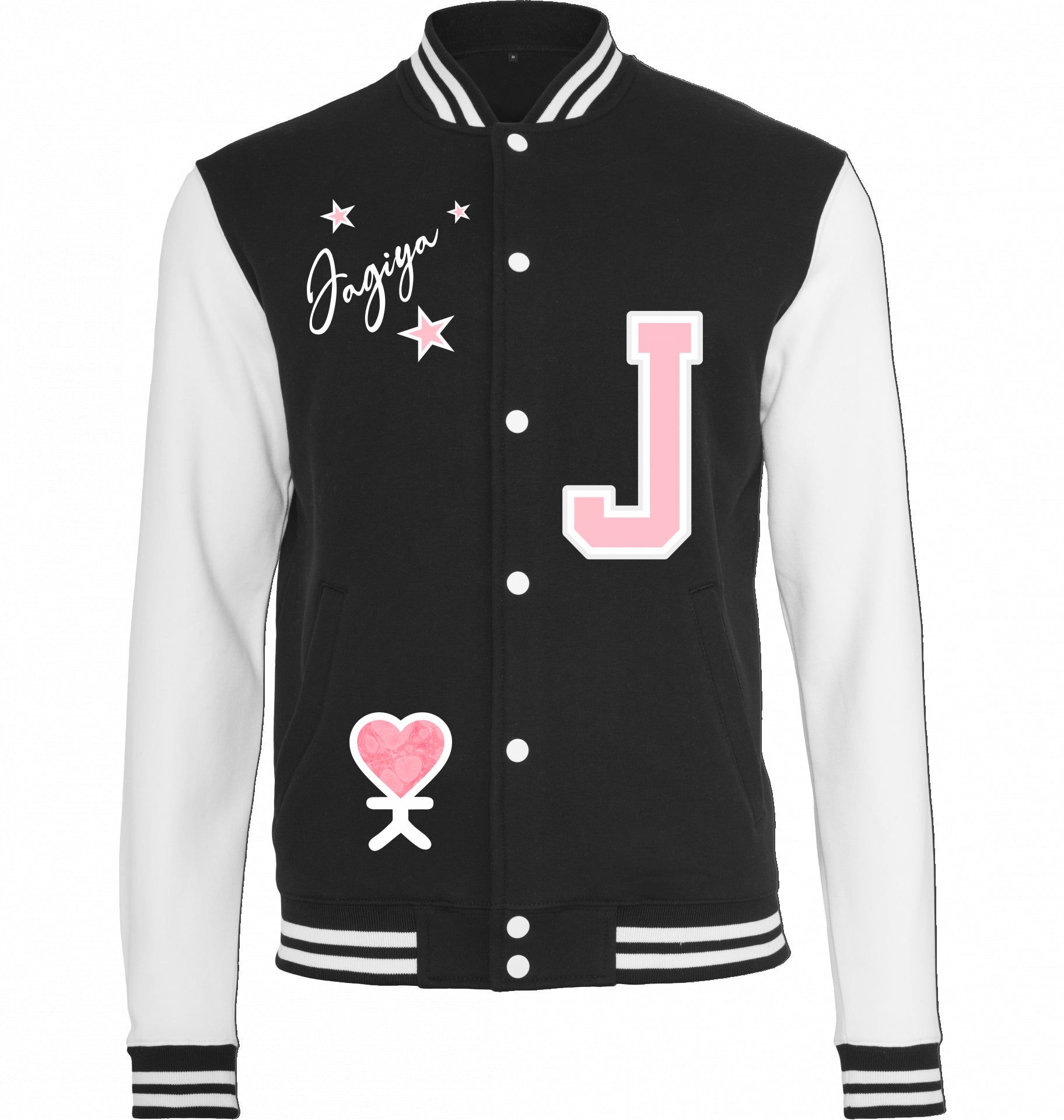 Casual college jacket in a trendy oversized boyfriend cut—perfect for K-pop fans and anyone who loves streetwear style. The jacket features a black body, white sleeves, and stylish details that make it a real eye-catcher. On the front: a large “J” appliqué, “Jagiya” lettering, stars, and a heart symbol in soft pink. The back has a bold “call me JAGIYA” print. Two practical side pockets on the front made from the main fabric, striped ribbed cuffs on the collar, hem, and sleeves, and sturdy metal snap buttons in a contrasting color complete the design. The inside is lined with brushed sweat fabric for an extra-soft feel and cozy warmth.